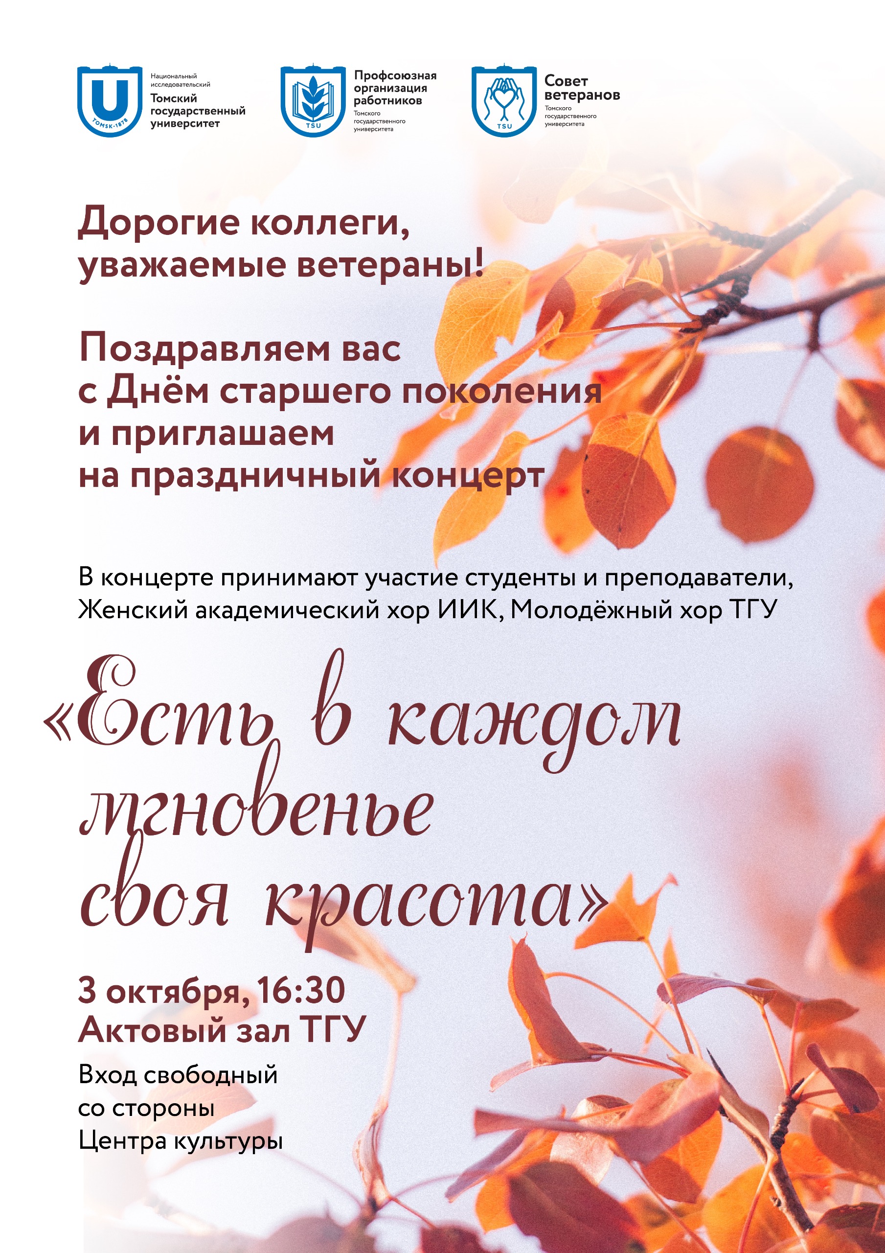 Приглашаем вас принять участие в торжественном мероприятии, посвященном Дню старшего поколения. Концерт состоится 3 октября в 16:30 в актовом зале Томского государственного университета.